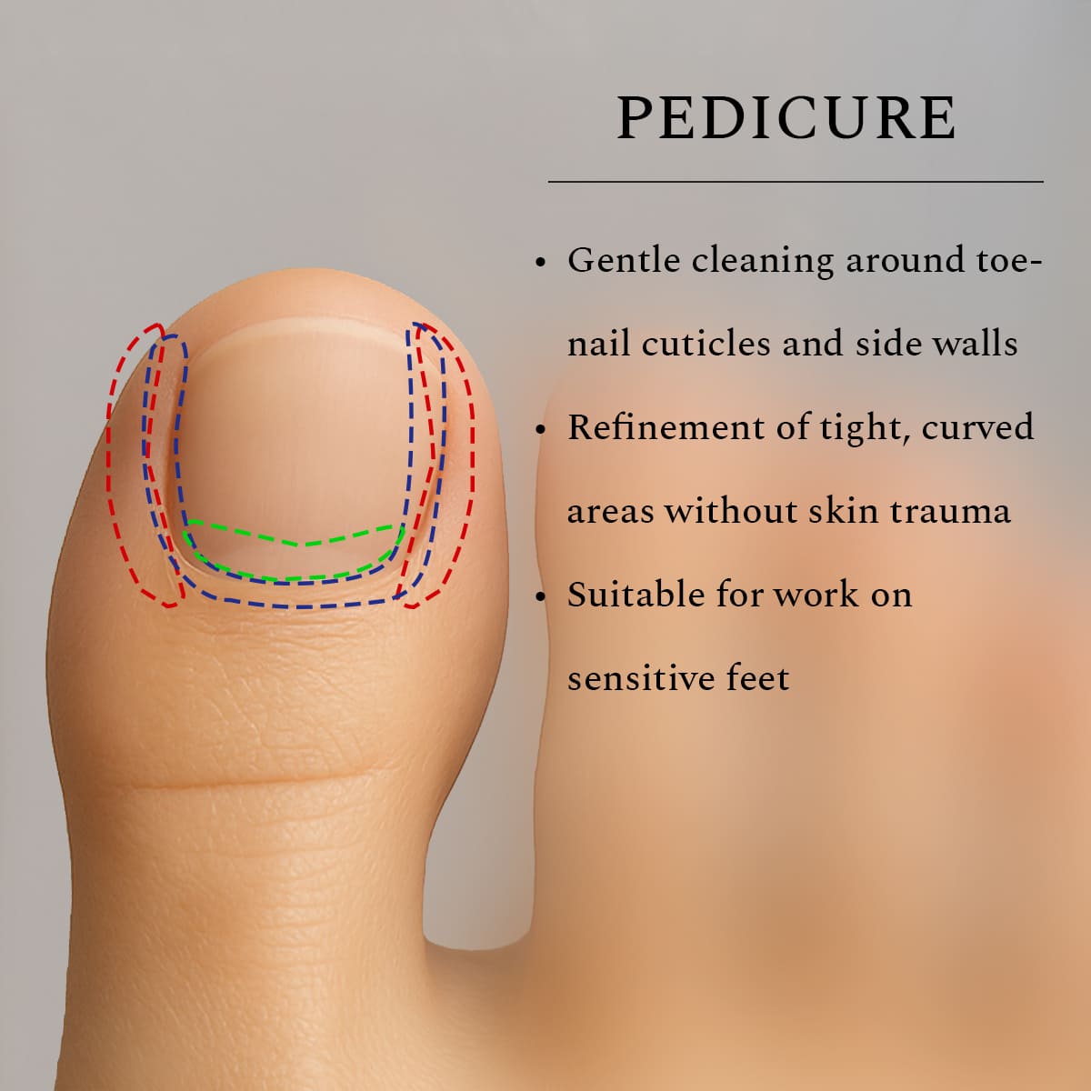 • Gentle cleaning around toenail cuticles and sidewalls