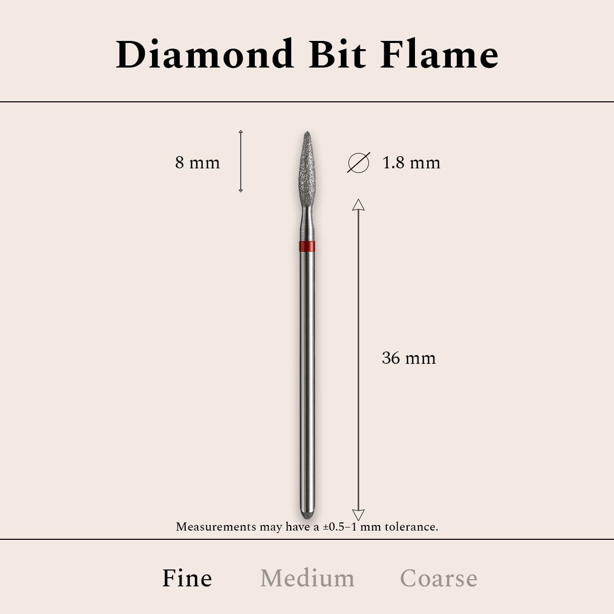 This fine-grit diamond flame bit with a 1.8 mm tip is designed for precise cuticle care and narrow-area detailing in both manicure and pedicure procedures. Its flame shape enables gentle lifting, exfoliation, and polishing with minimal skin contact and high control.